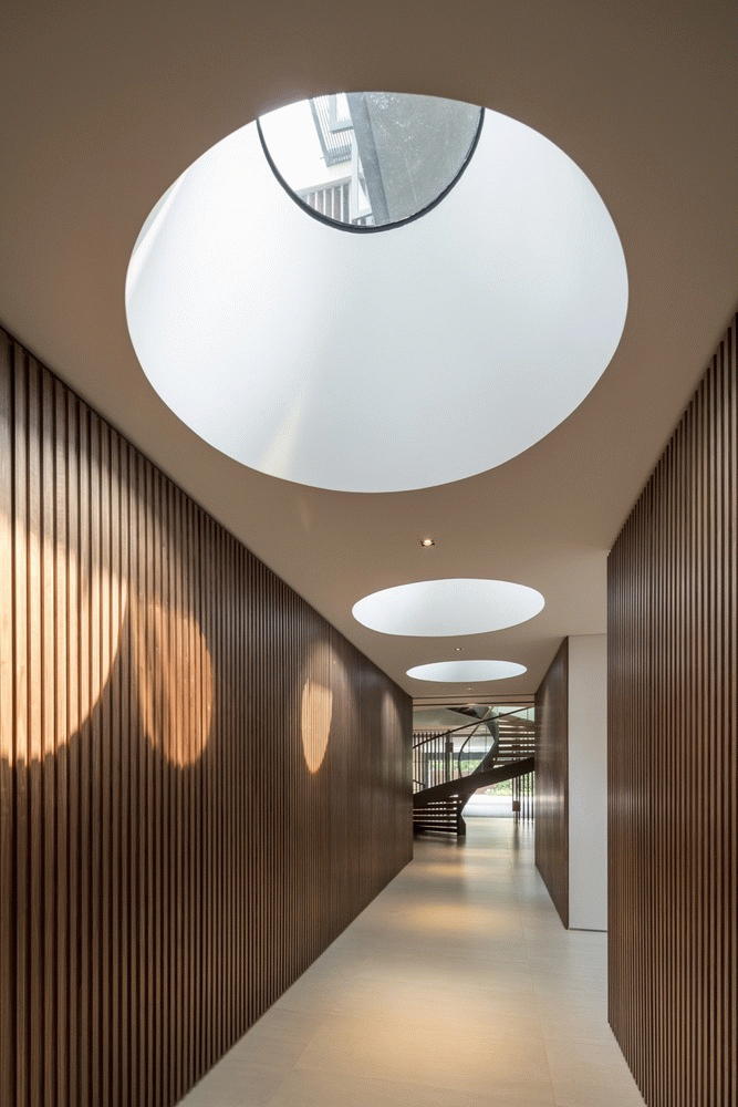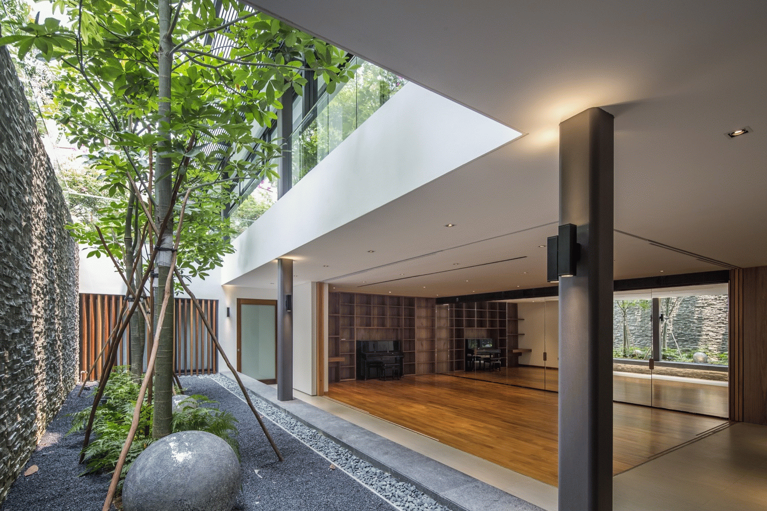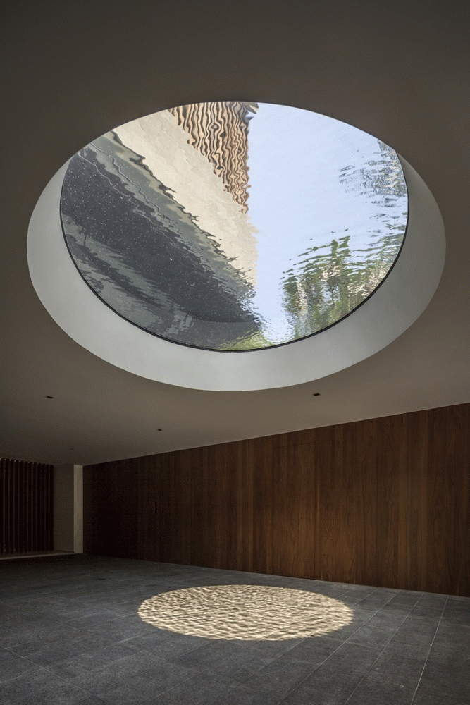 地下車庫的屋頂故意設計了一個圓形的天窗,天臺鋪滿了黑色的小石頭,同時注入水,很好地柔和了建筑冷酷的一面,呈現(xiàn)了東南亞現(xiàn)代簡約的園林特色。通過天井,建筑與園林之間,建立了一個友好的互動關系。
